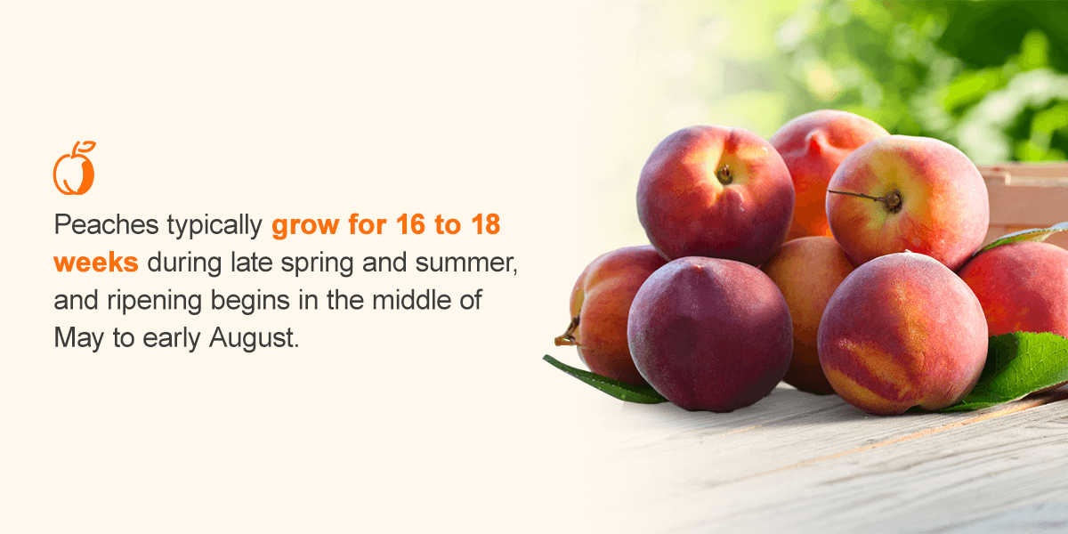 June is the peak season for peaches in the South, and our harvest window begins as early as May and extends into August. Summertime means warmer weather and optimal conditions for peach-growing and harvesting. Peaches typically grow for 16 to 18 weeks during late spring and summer, and ripening begins in the middle of May to early August.