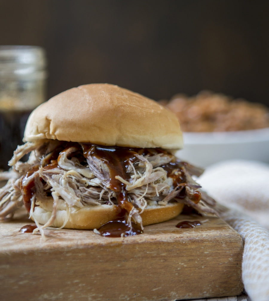 Slow-roasted Pulled Pork, BBQ Sauce on a bun.