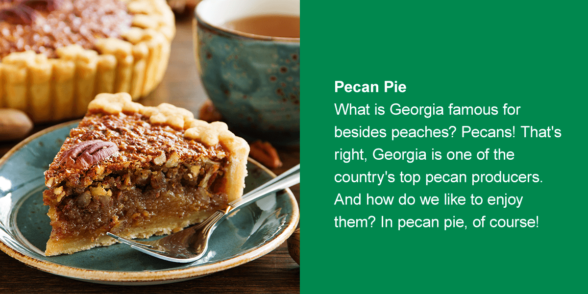 What is Georgia famous for besides peaches? Pecans! That's right, Georgia is one of the country's top pecan producers. And how do we like to enjoy them? In pecan pie, of course!
